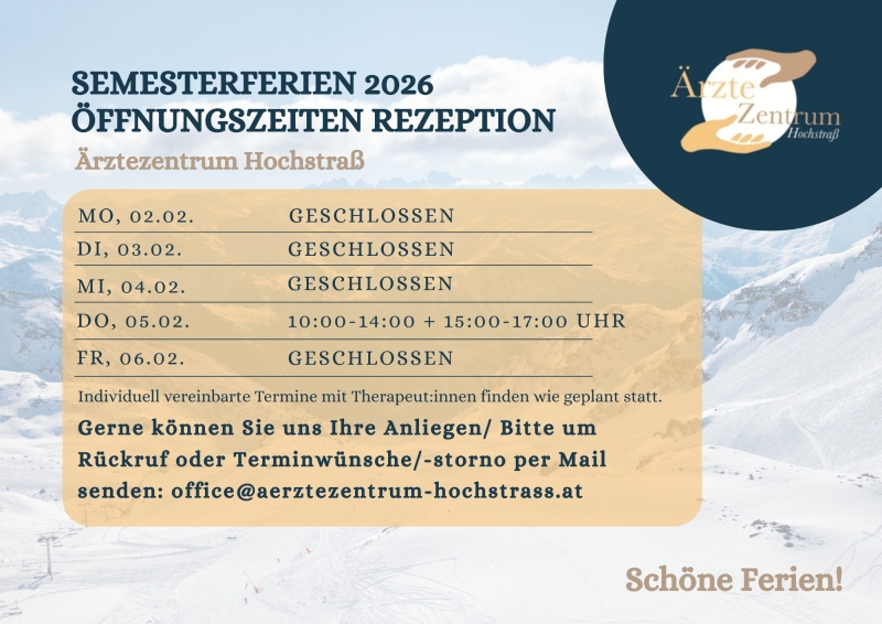 Am Donnerstag 05.02. ist die Rezeption geöffnet. Weiters haben wir an diesem Tag extra Kapazitäten geschaffen für Blutabnahmen (Vorsorgeuntersuchungen), Kosmetik und Massage. Bei Interesse melden Sie sich bei unserem Rezeptionsteam.